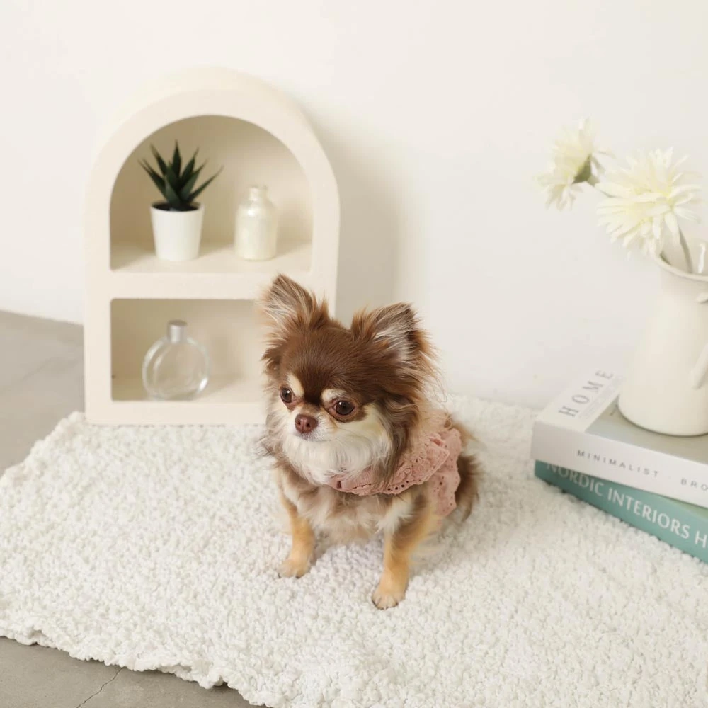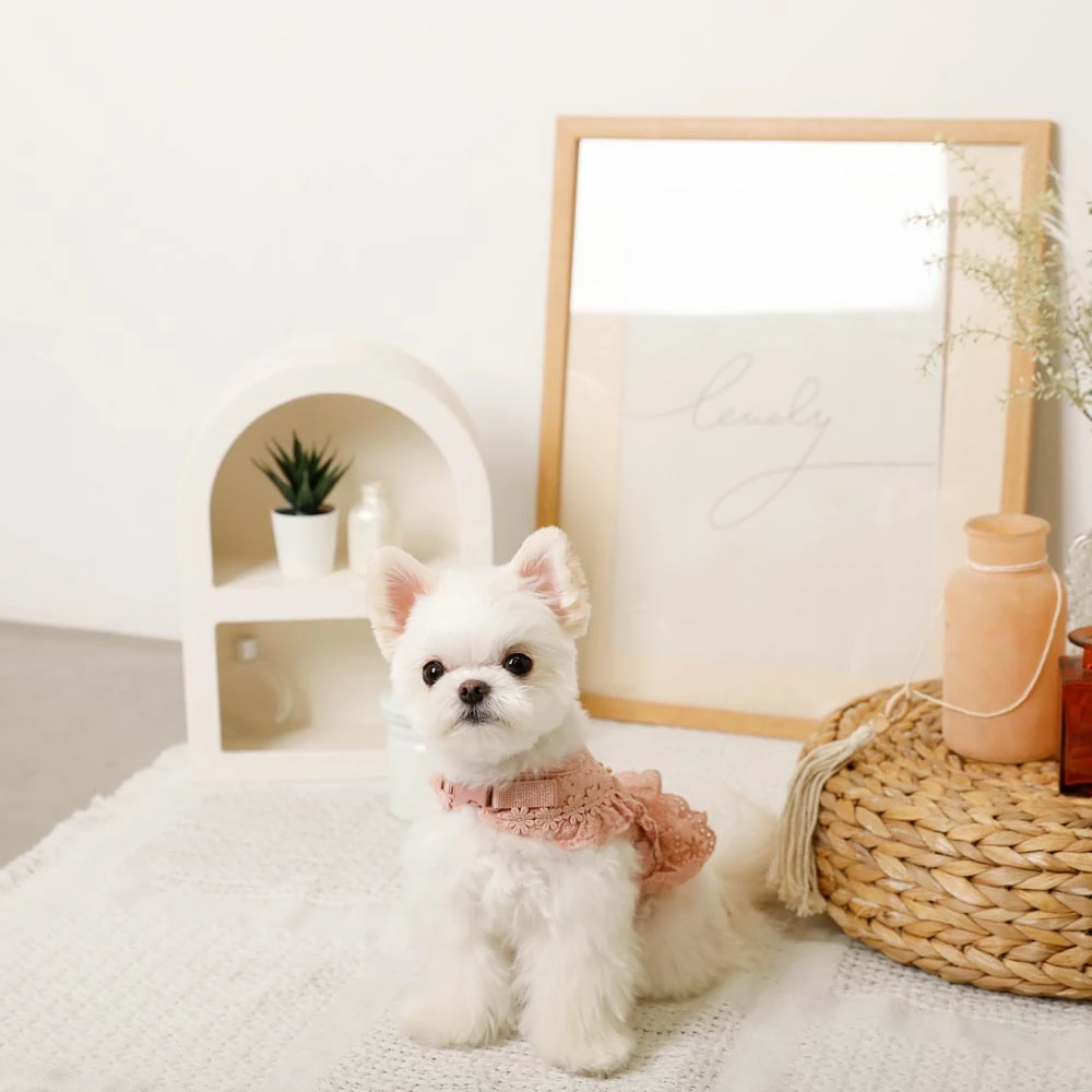 繊細なレースワークとエレガントなフリルデザインは、職人の手作業による丁寧な仕上げです。どの角度から見ても美しく、愛犬の動きに合わせて優雅に揺れるフリルが、より一層の可愛らしさを引き出します。